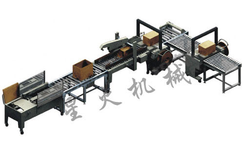 周口打包機 客戶名稱:周口鹿邑金日食用油有限公司 設(shè)備名稱:XFK-3自動封底封箱“井”字捆扎包裝流水線